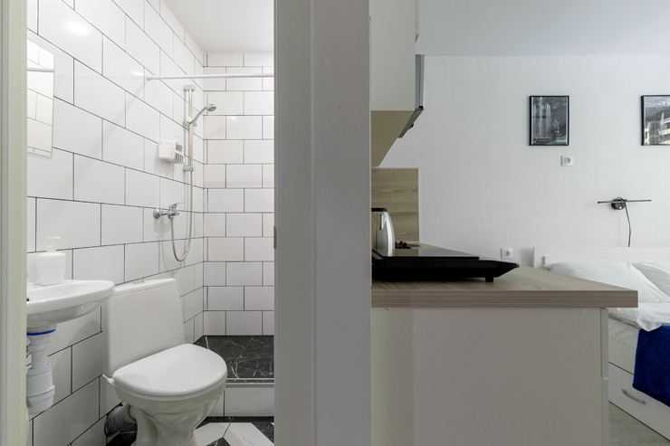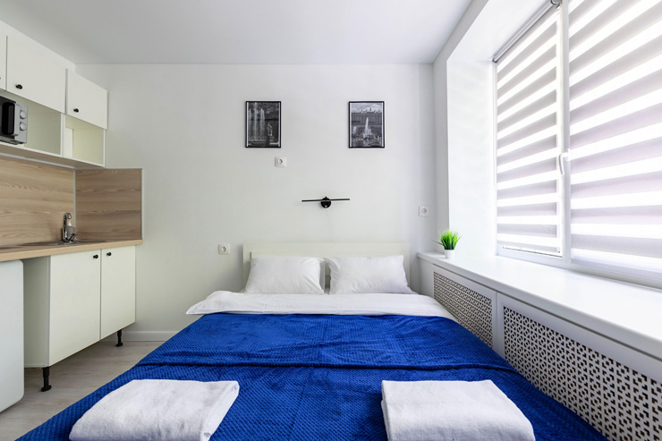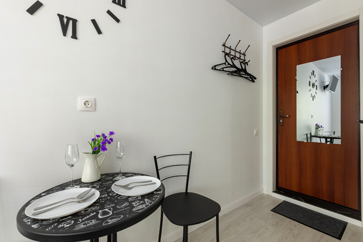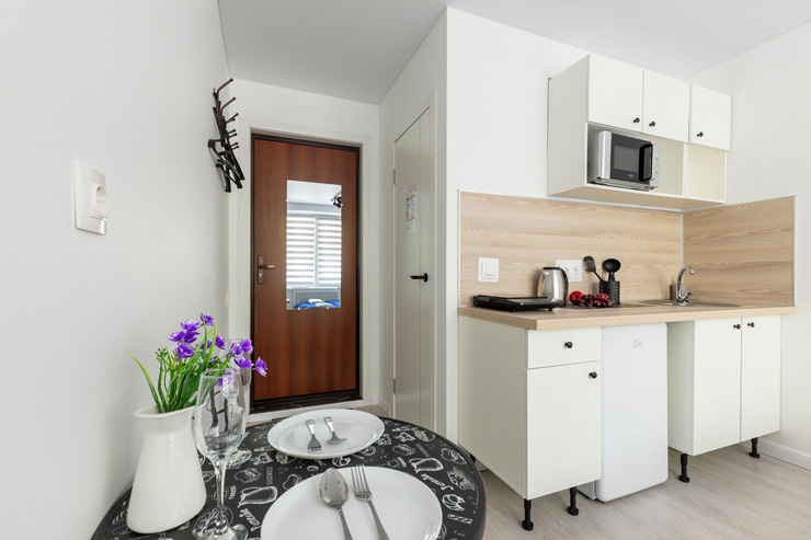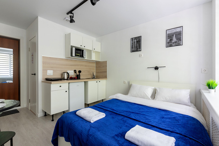 | Студия 2-местная | 16 кв.м. | 2 чел. | Мебель (вешалка, зеркало, кровать двуспальная, стол, стулья, шкаф), Мини-кухня, Оборудование (микров... |