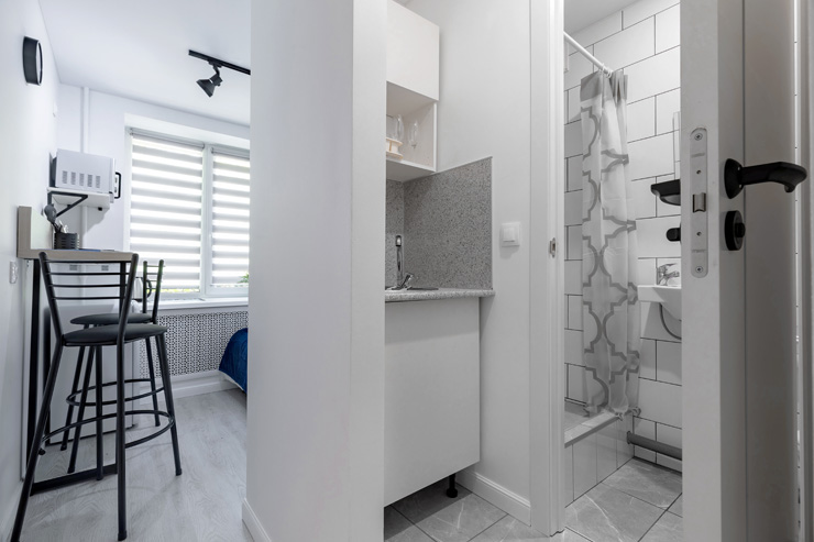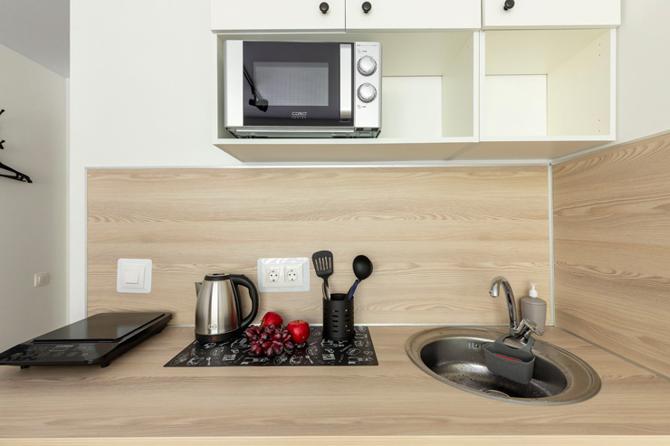 - Оборудование: микроволновая печь, мини-холодильник, набор посуды, плита электрическая, стиральная машина, телевизор, утюг, электрочайник